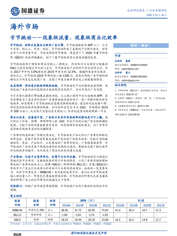 【国盛证券】【20200126】计算机:字节跳动——现象级流量、现象级商业化效率-18页 行业研究