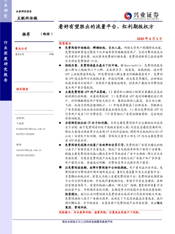 【兴业证券】【20200605】互联网传媒:看好有望胜出的流量平台、红利期版权方-19页 行业研究