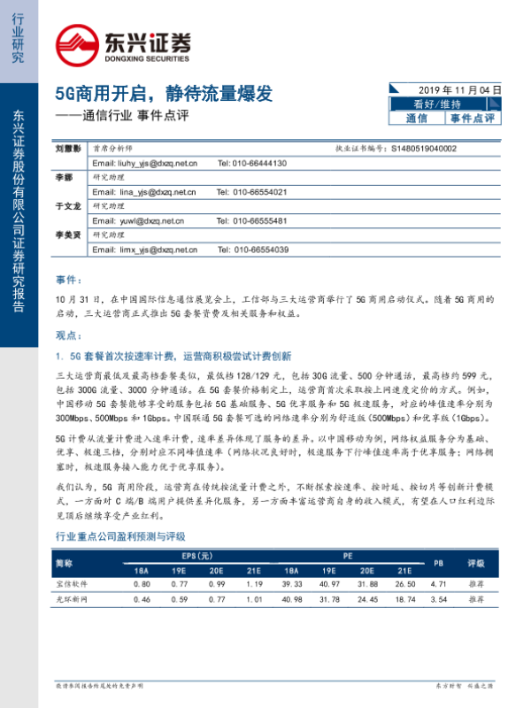 【东兴证券】【20191104】通信行业事件点评:5G商用开启,静待流量爆发-4页 行业研究