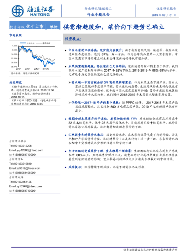 【海通证券】【20190201】20190201-海通证券-造纸轻工行业专题报告:供需渐趋缓和,浆价向下趋势已确立-39页 行业研究