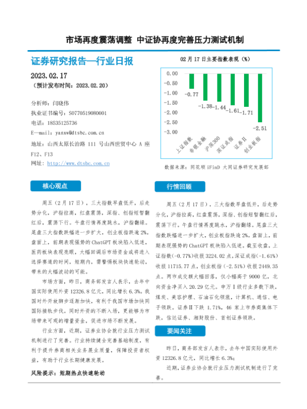 【大同证券】【20230217】非银金融行业日报:市场再度震荡调整 中证协再度完善压力测试机制-10页 行业研究