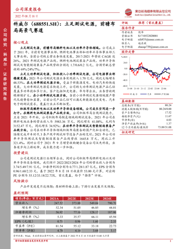 【东亚前海证券】【20220818】科威尔(688551.SH):立足测试电源,前瞻布局高景气赛道-31页 行业研究