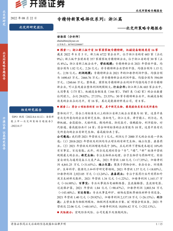 【开源证券】【20220822】北交所策略专题报告:专精特新策略择优系列,浙江篇-15页 行业研究