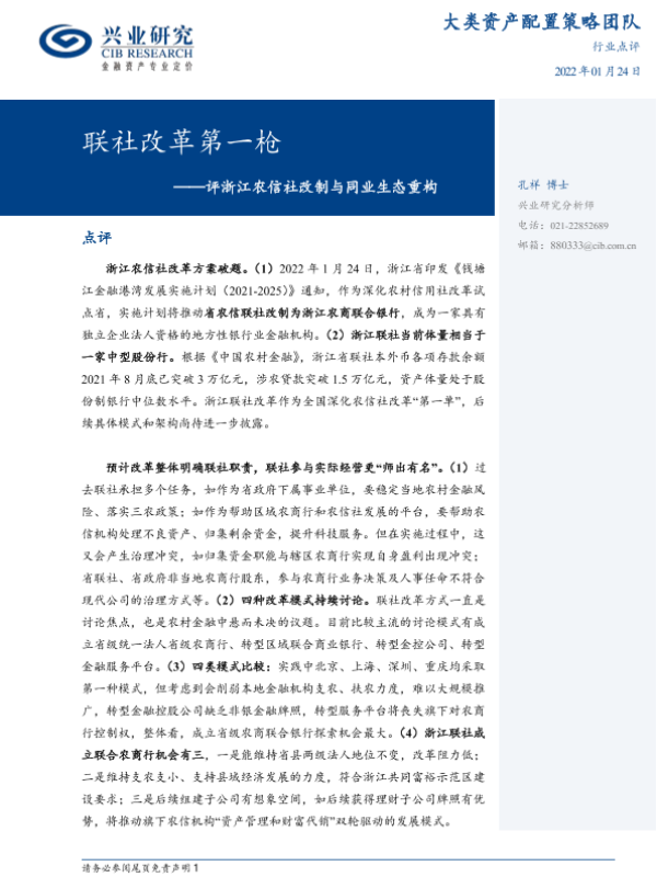【兴业研究】【20220124】评浙江农信社改制与同业生态重构-3页 行业研究