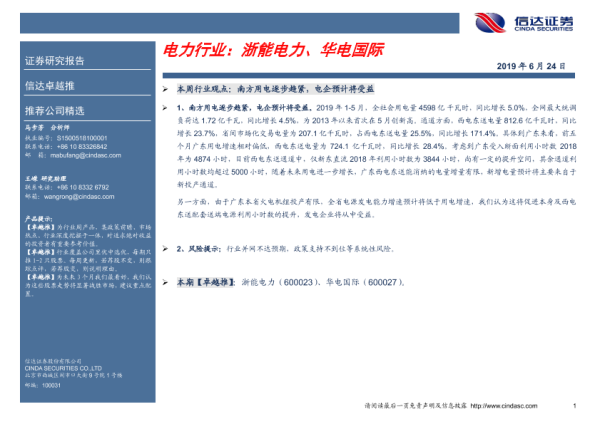 【信达证券】【20190624】电力行业:浙能电力、华电国际-5页 行业研究