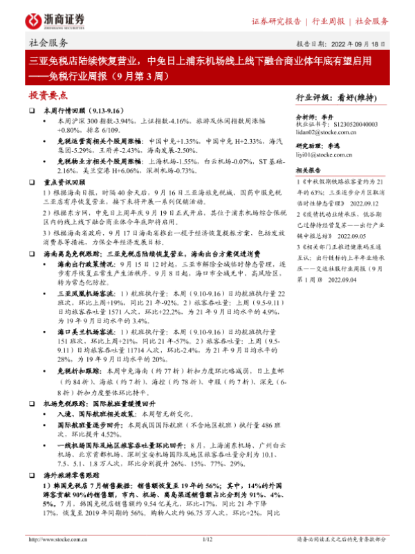 【浙商证券】【20220918】免税行业周报:三亚免税店陆续恢复营业,中免日上浦东机场线上线下融合商业体年底有望启用-12页 行业研究