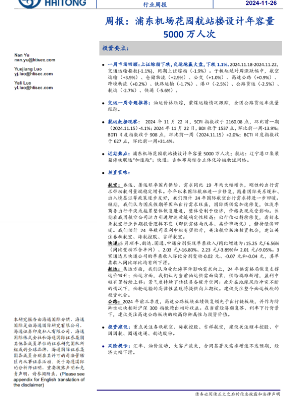 【海通国际】【20241126】交通运输周报:浦东机场花园航站楼设计年容量5000万人次-18页 行业研究