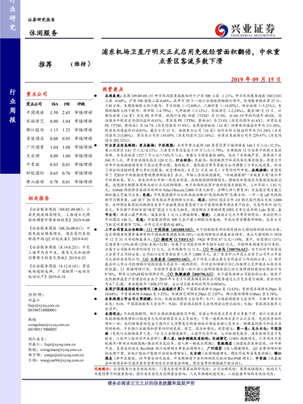【兴业证券】【20190915】浦东机场卫星厅明天正式启用免税经营面积翻倍,中秋重点景区客流多数下滑-15页 行业研究