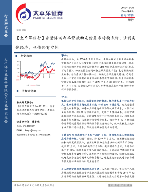 【太平洋证券】【20191230】存量浮动利率贷款的定价基准转换点评:让利实体经济,估值仍有空间-6页 行业研究