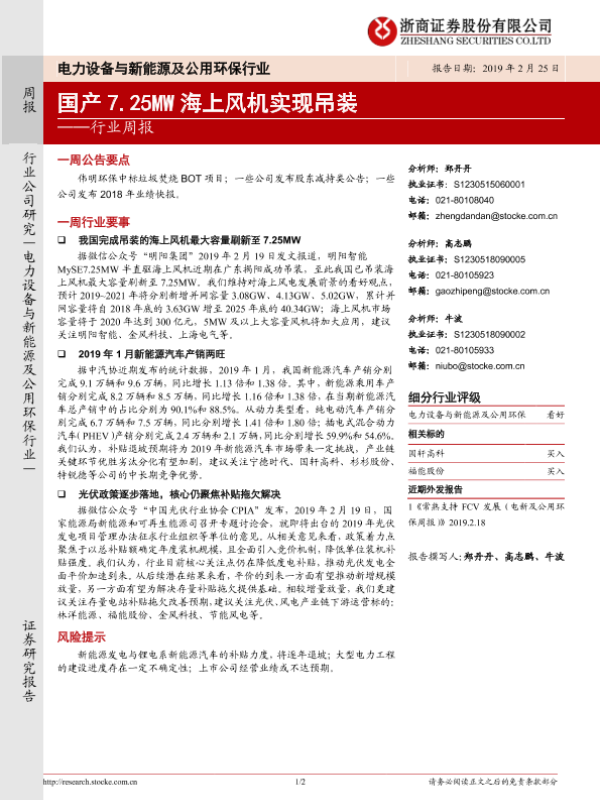 【浙商证券】【20190225】电力设备与新能源及公用环保行业周报:国产7.25MW海上风机实现吊装-2页 行业研究
