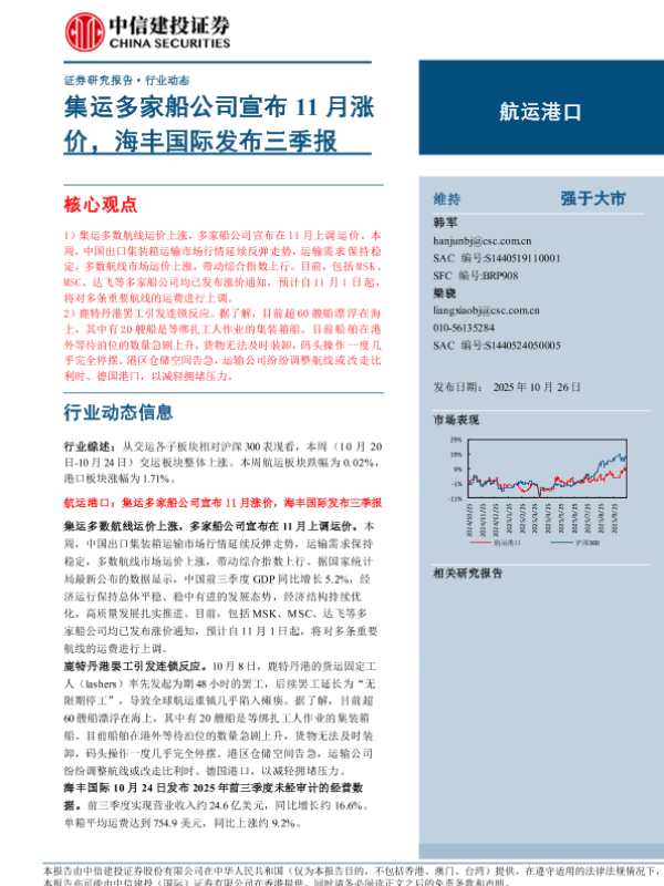 【中信建投证券】【202510】航运港口行业动态:集运多家船公司宣布11月涨价,海丰国际发布三季报-21页 证券期货研究报告
