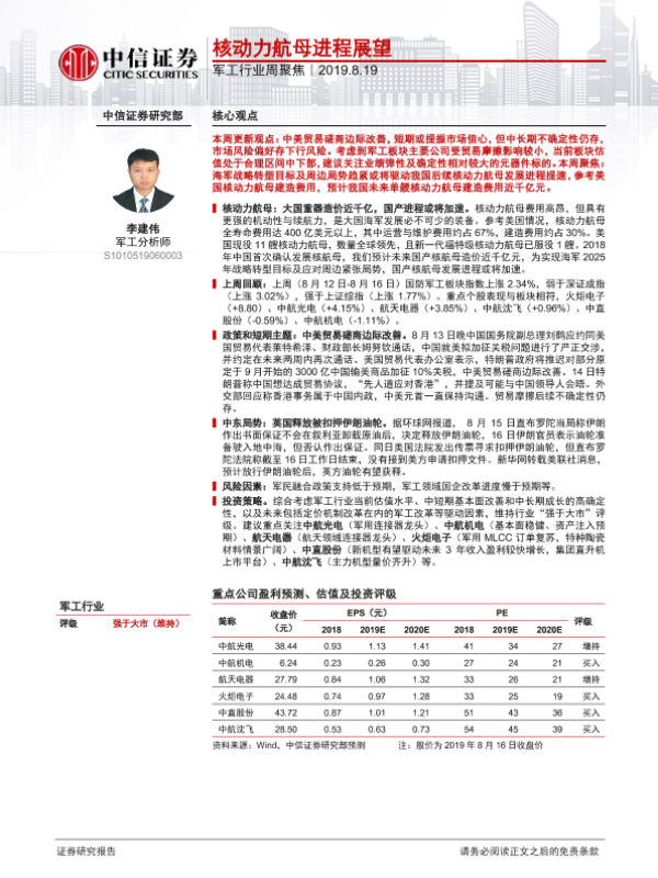 【中信证券】【20190819】20190819-中信证券-军工行业周聚焦:核动力航母进程展望-18页 行业研究
