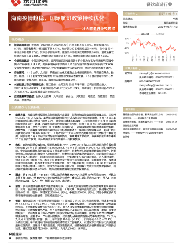 【东方证券】【20220817】社会服务行业双周报:海南疫情趋稳,国际航班政策持续优化-13页 行业研究