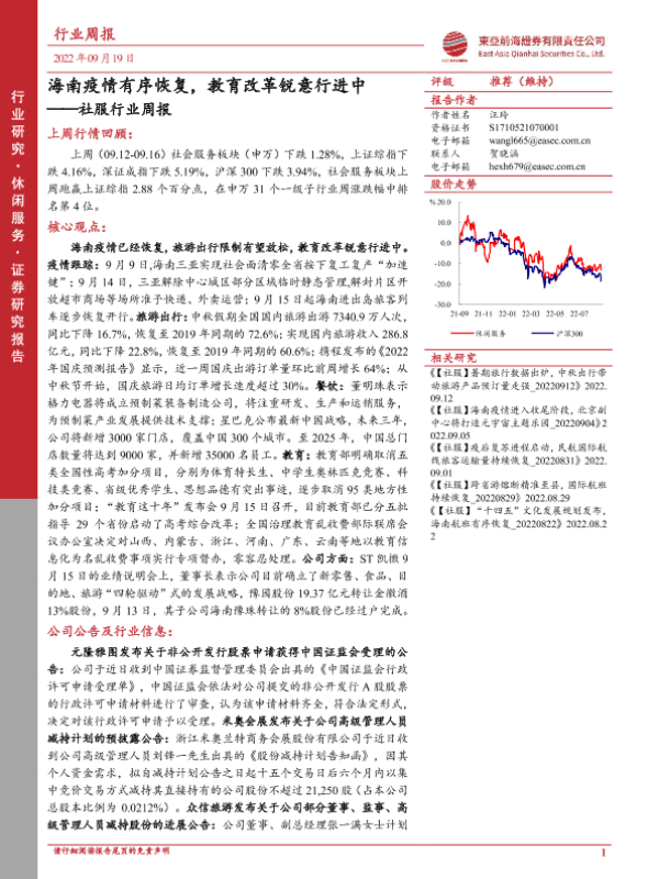 【东亚前海证券】【20220919】社服行业周报:海南疫情有序恢复,教育改革锐意行进中-11页 行业研究