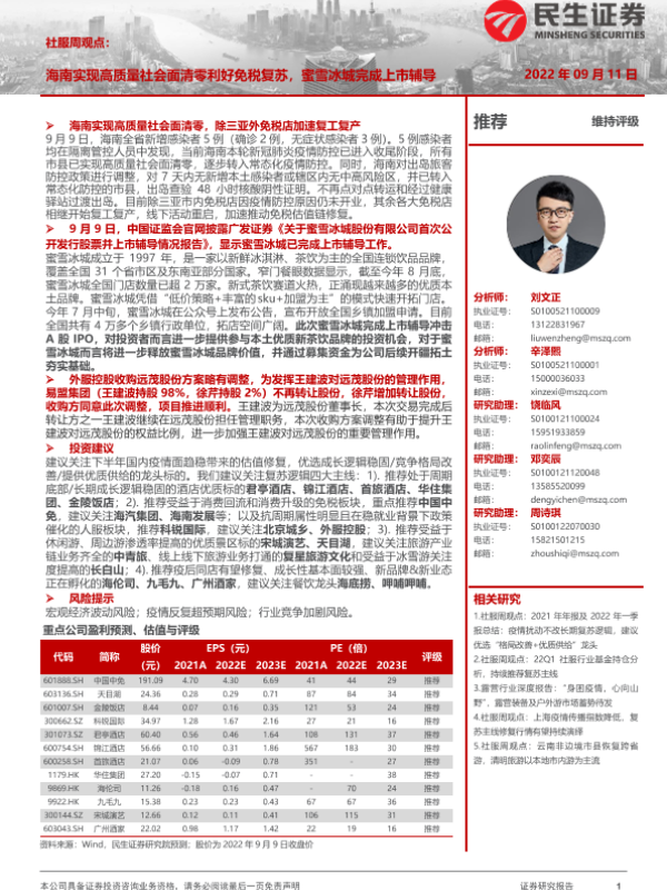 【民生证券】【20220911】社服周观点:海南实现高质量社会面清零利好免税复苏,蜜雪冰城完成上市辅导-21页 行业研究