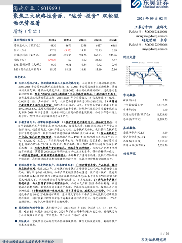 【东吴证券】【20240902】海南矿业(601969)聚焦三大战略性资源,“运营+投资”双轮驱动优势显著-30页 行业研究
