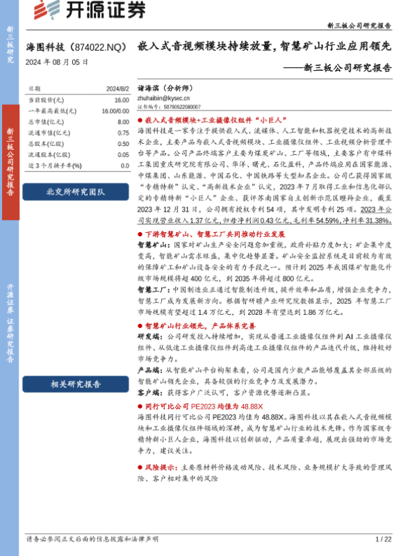 【开源证券】【20240805】海图科技(874022)新三板公司研究报告:嵌入式音视频模块持续放量,智慧矿山行业应用领先-22页 行业研究