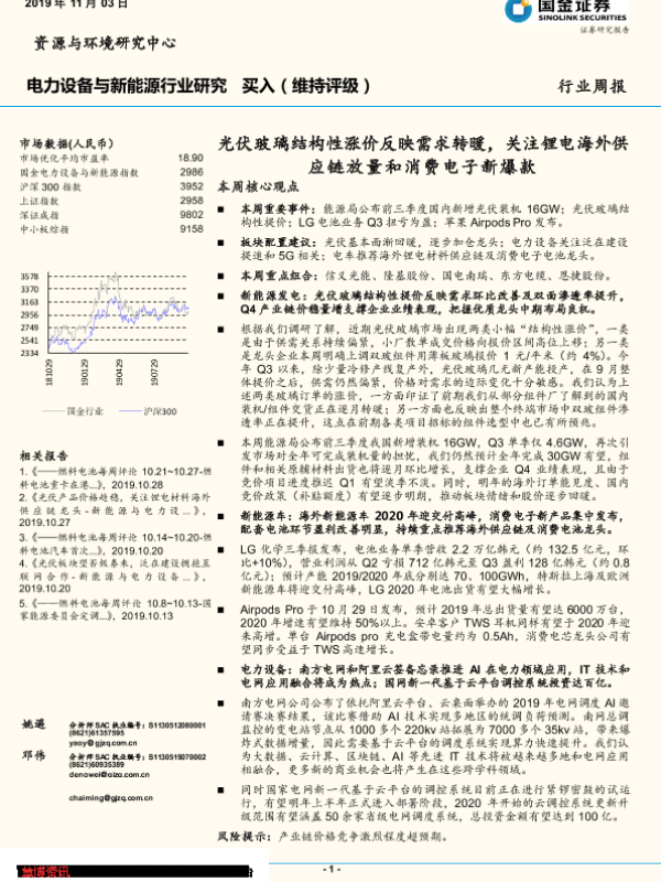 【国金证券】【20191103】电力设备与新能源行业研究周报:光伏玻璃结构性涨价反映需求转暖,关注锂电海外供应链放量和消费电子新爆款-4页 行业研究