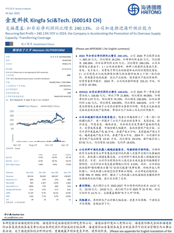 【海通国际】【20250424】金发科技(600143)交接覆盖:扣非后净利润同比增长240.13%,公司加速推进海外供应能力-14页 公司研究