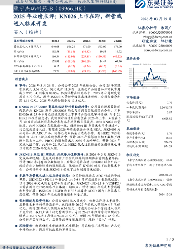 【东吴证券】【202603】康宁杰瑞制药-B(09966.HK):2025年业绩点评:KN026上市在即,新管线进入临床开发-3页 证券期货研究报告