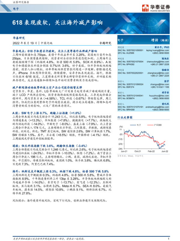 【华泰证券】【20220619】电子行业专题研究:618表现疲软,关注海外减产影响-20页 行业研究