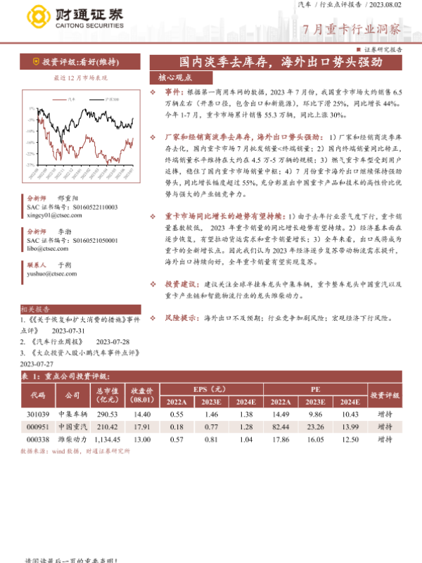 【财通证券】【20230802】7月重卡行业洞察_国内淡季去库存_海外出口势头强劲-2页 行业研究
