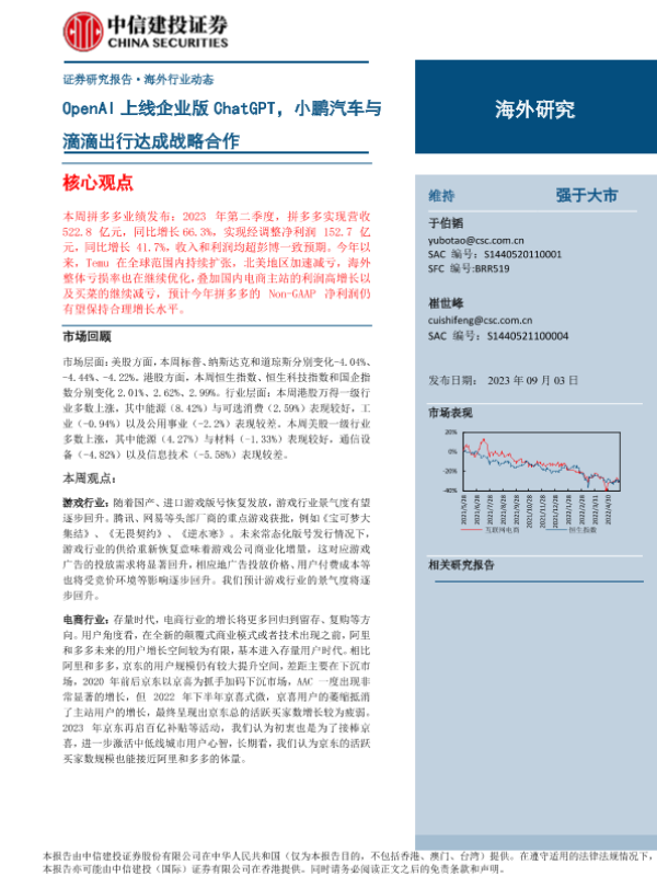 【中信建投证券】【20230903】互联网电商行业海外行业动态:OpenAI上线企业版ChatGPT,小鹏汽车与滴滴出行达成战略合作-24页 行业研究