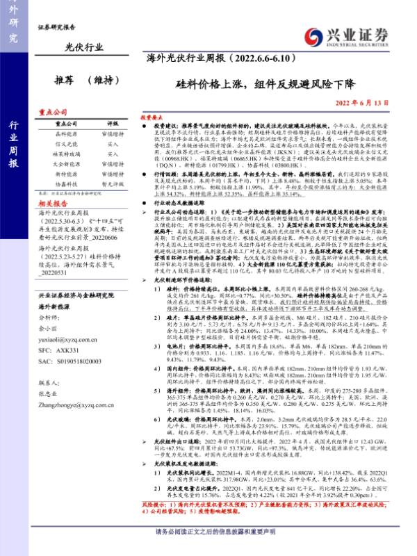 【兴业证券】【20220613】海外光伏行业周报:硅料价格上涨,组件反规避风险下降-16页 行业研究