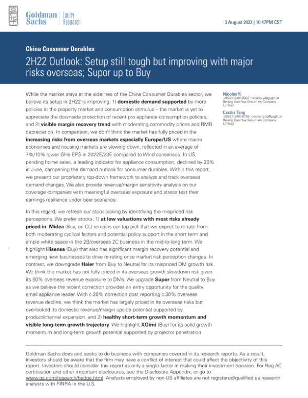 【Goldman Sachs】【20220803】etup still tough but improving with major risks overseas; Supor up to Buy-58页 行业研究