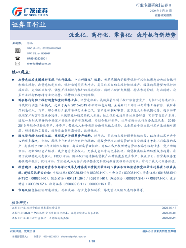 【广发证券】【20200921】证券Ⅱ行业专题研究:混业化、商行化、零售化:海外投行新趋势-28页 行业研究