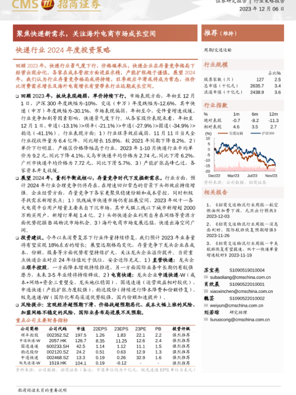 【海通证券】【20231206】快递行业2024年度投资策略:聚焦快递新需求,关注海外电商市场成长空间-21页 行业研究
