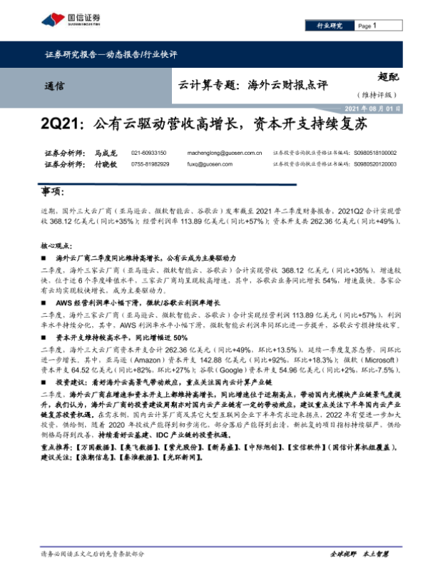 【国信证券】【20210801】通信:云计算专题:海外云财报点评:2Q21:公有云驱动营收高增长,资本开支持续复苏-8页 行业研究