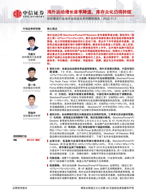 【中信证券】【20221103】纺织服装行业海外运动龙头系列跟踪报告:海外运动增长逐季降速,库存去化仍将持续-23页 行业研究
