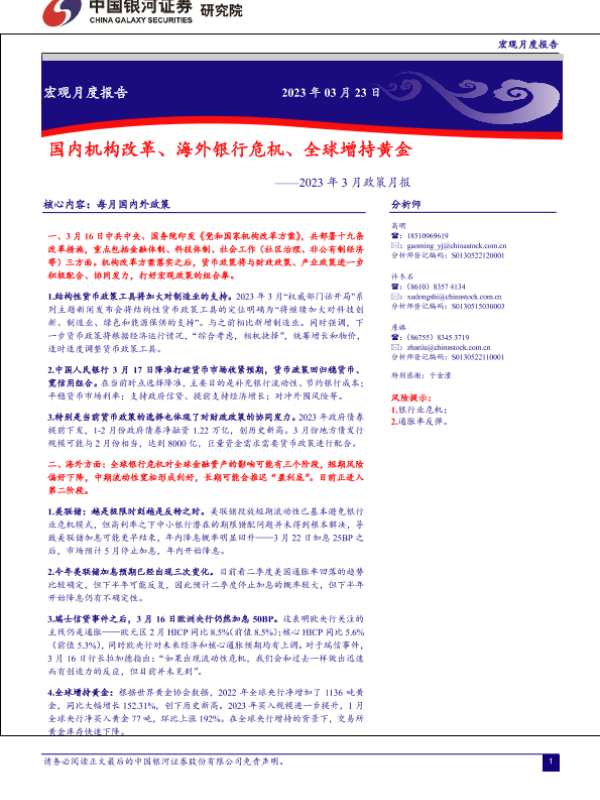 【银河证券】【20230323】2023年3月政策月报:国内机构改革、海外银行危机、全球增持黄金-15页 行业研究