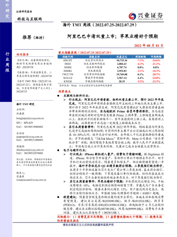 【兴业证券】【20220801】20220801-兴业证券-科技与互联网海外TMT周报:阿里巴巴申请双重上市;苹果业绩好于预期-16页 行业研究