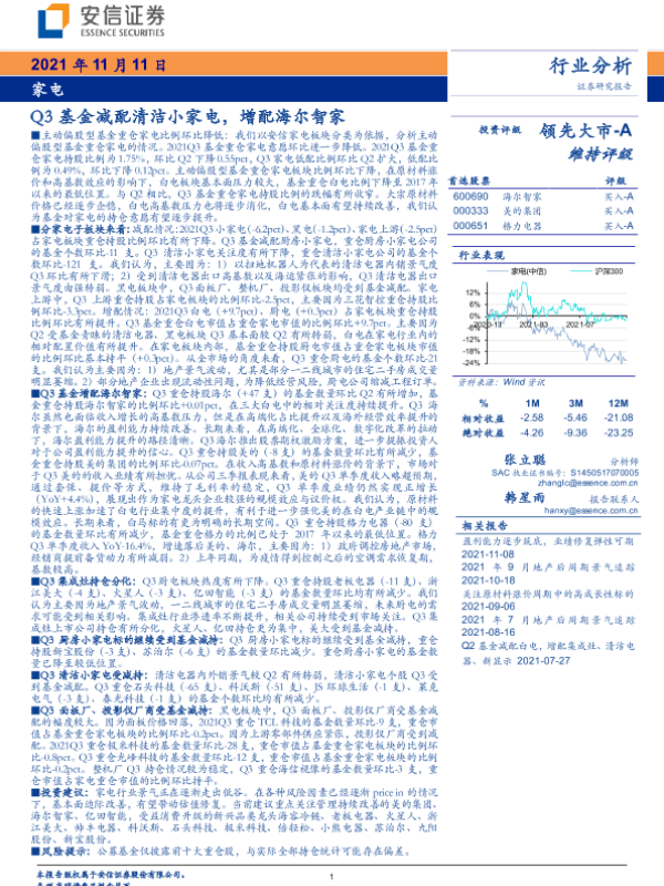 【安信证券】【20211111】Q3基金减配清洁小家电,增配海尔智家-13页 行业研究