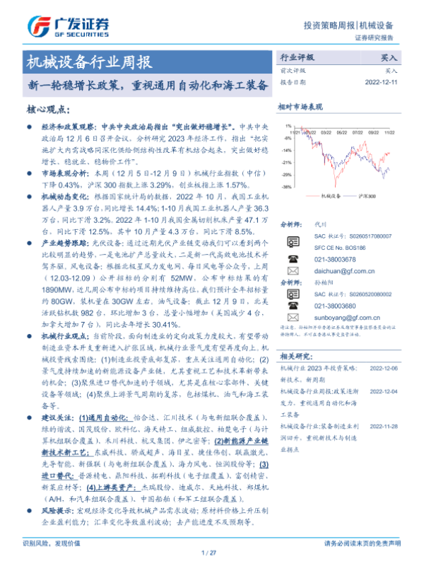 【广发证券】【20221211】20221211-广发证券-机械设备行业周报:新一轮稳增长政策,重视通用自动化和海工装备-27页 行业研究