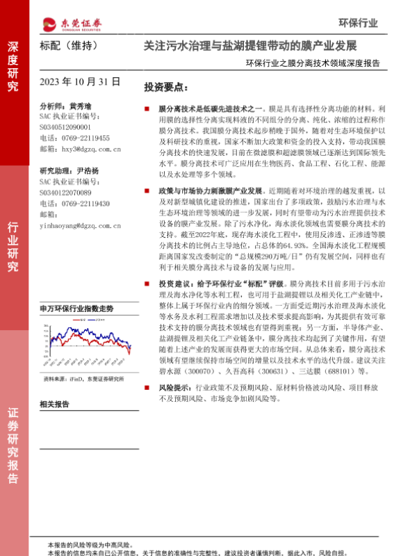 【东莞证券】【20231031】环保行业之膜分离技术领域深度报告-关注污水治理与盐湖提锂带动的膜产业发展-18页 行业研究