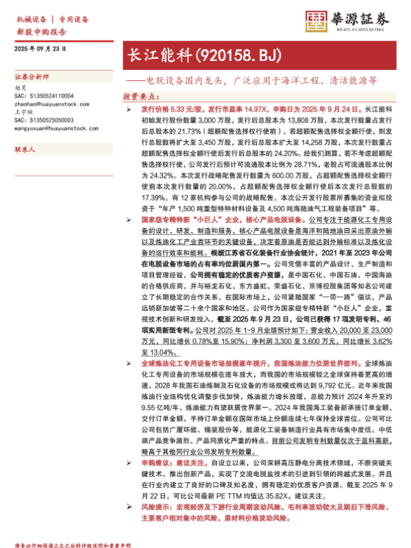 【华源证券】【202509】长江能科(920158)电脱设备国内龙头,广泛应用于海洋工程、清洁能源等-19页 证券期货研究报告