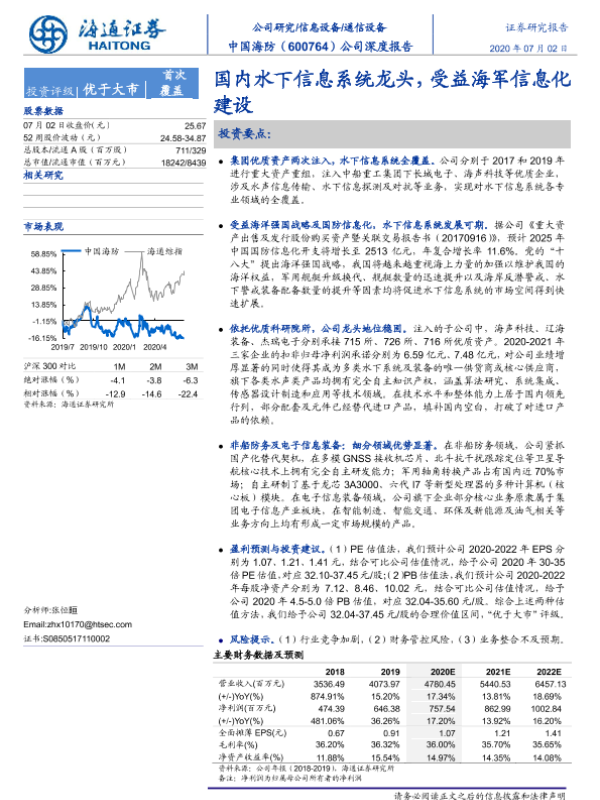 【海通证券】【20200702】中国海防-600764.SH-公司深度报告:国内水下信息系统龙头,受益海军信息化建设-35页 行业研究