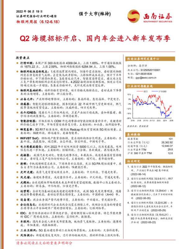 【西南证券】【20220619】20220619-西南证券-物联网周报:Q2海缆招标开启、国内车企进入新车发布季-20页 行业研究