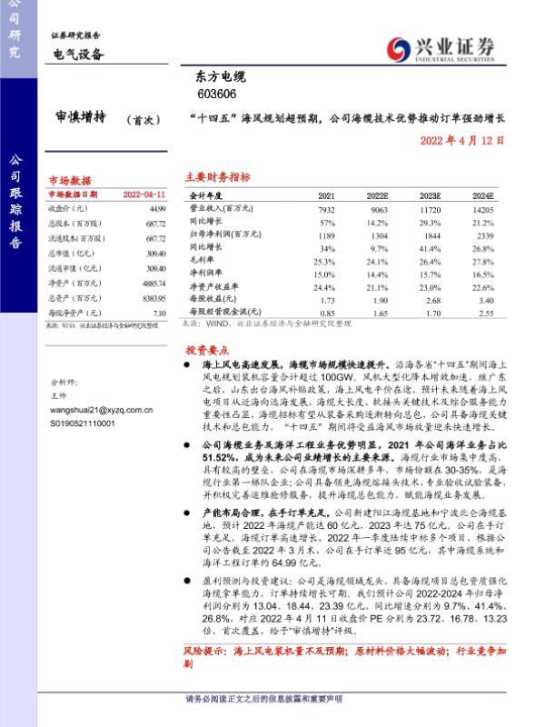 【兴业证券】【20220412】“十四五”海风规划超预期,公司海缆技术优势推动订单强劲增长-26页 行业研究
