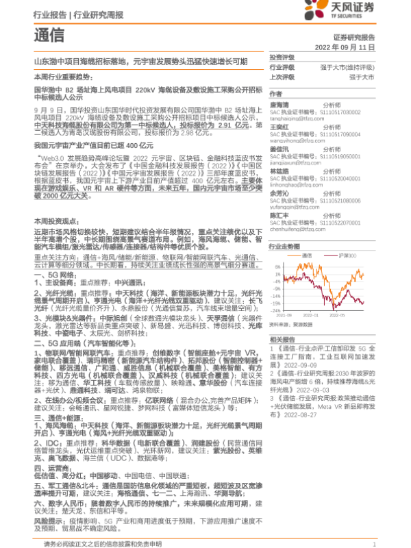 【天风证券】【20220911】通信行业研究周报:山东渤中项目海缆招标落地,元宇宙发展势头迅猛快速增长可期-11页 行业研究