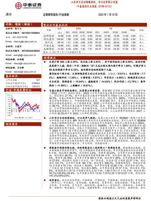 【中泰证券】【20230115】中泰证券-中泰通信行业周报:山东项目启动海缆招标,关注运营商云发展-19页 行业研究