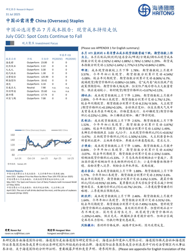 【海通国际】【202507】中国必选消费品 7月成本报告:现货成本持续走低-16页 证券期货研究报告