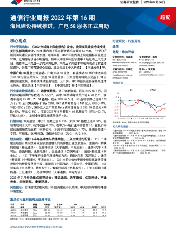 【国信证券】【20220704】通信行业周报2022年第16期:海风建设持续推进,广电5G服务正式启动-28页 行业研究