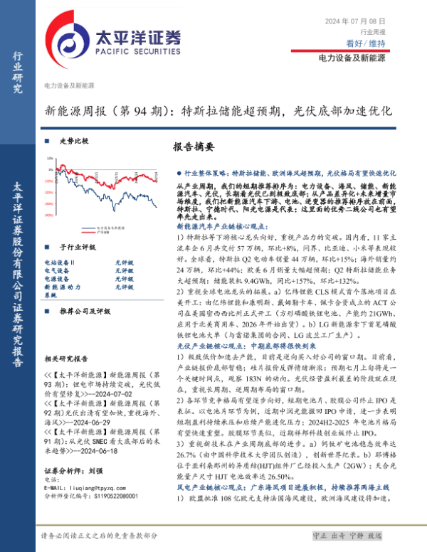 【太平洋证券】【20240708】20240708-太平洋-电力设备及新能源行业新能源周报(第94期):特斯拉储能超预期,光伏底部加速优化-35页 行业研究