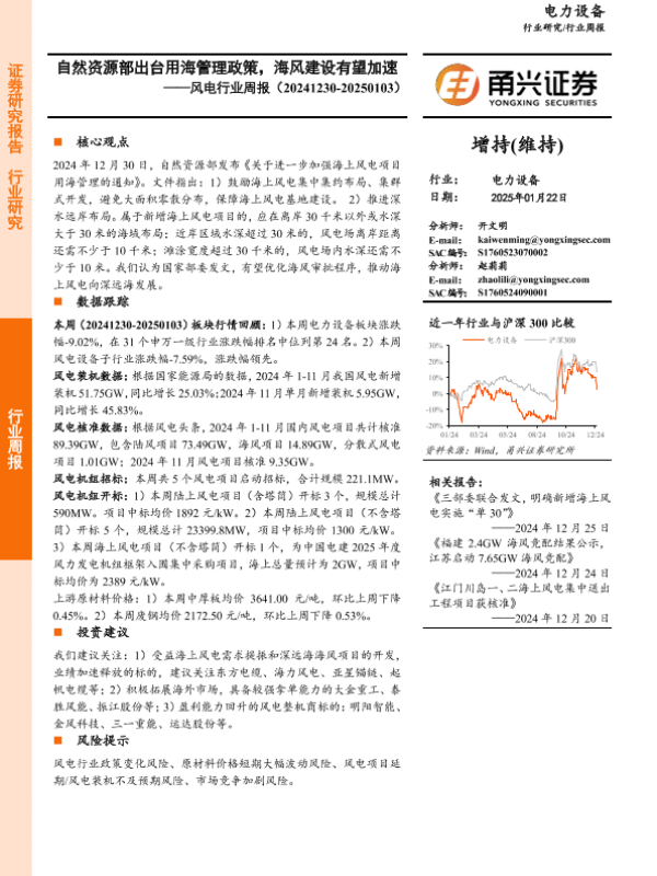 【甬兴证券】【20250122】风电行业周报:自然资源部出台用海管理政策,海风建设有望加速-15页 行业研究