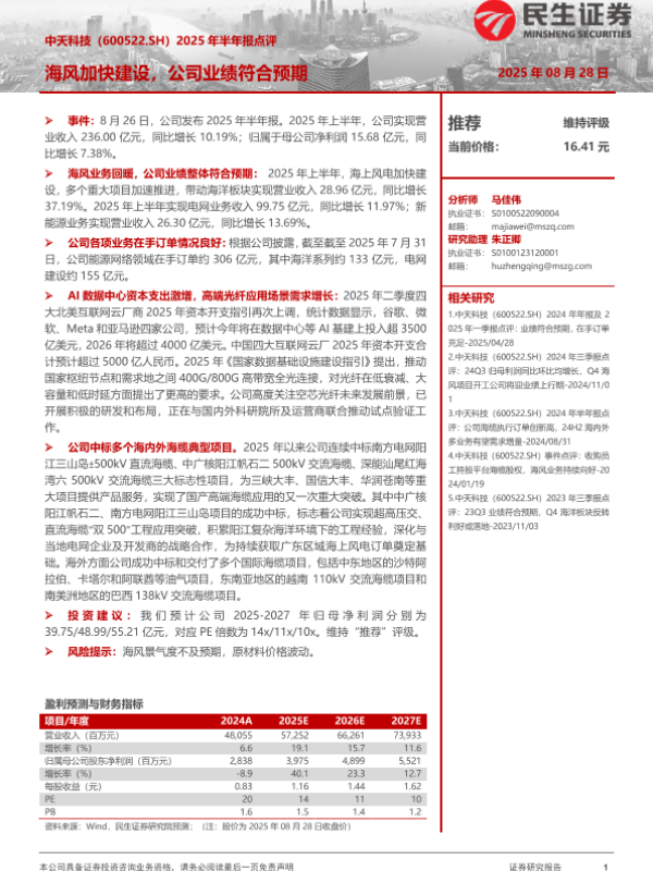 【海风加快建设&公司业绩符合预期】【20250828】中天科技-海风加快建设,公司业绩符合预期-3页 证券期货研究报告