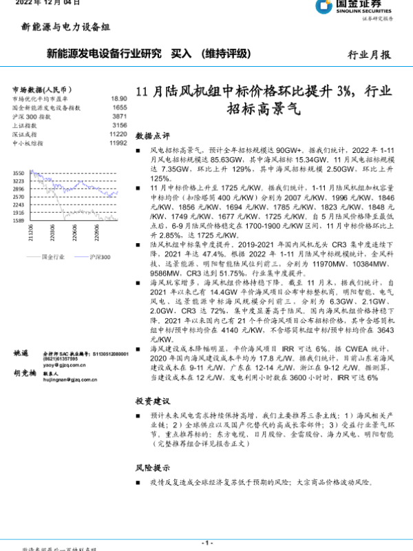 【国金证券】【20221204】20221204-国金证券-新能源发电设备行业研究:11月陆风机组中标价格环比提升3%,行业招标高景气-12页 行业研究